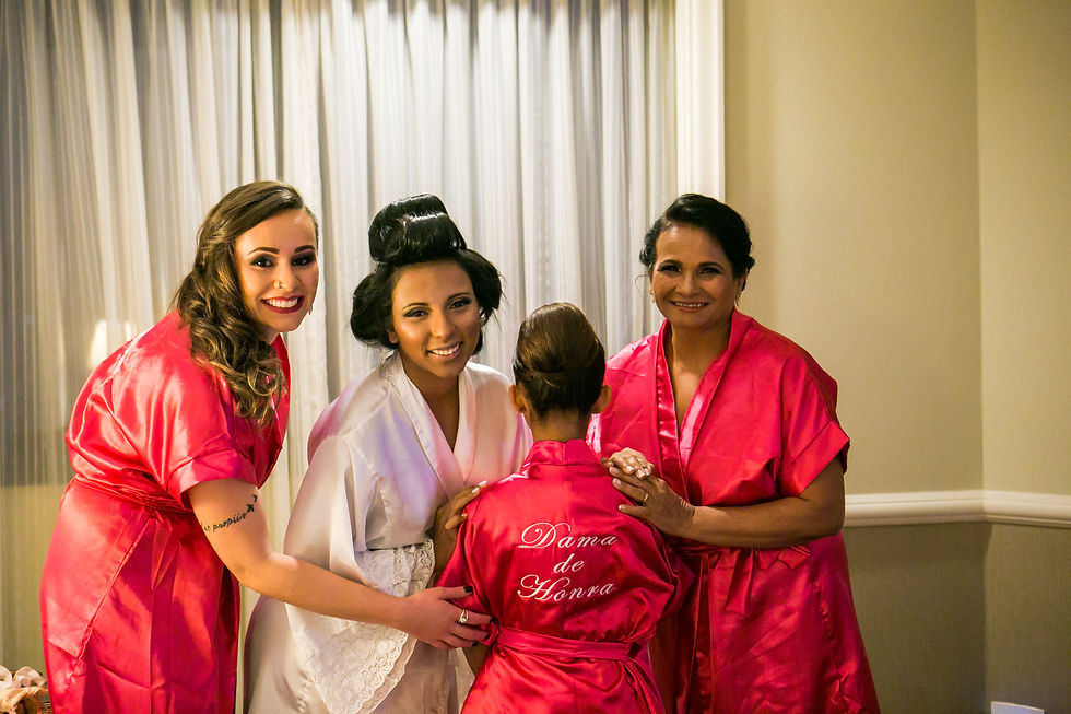 As pessoas que me acompanharam no dia de noiva foram minha mãe, minha cunhada, minha melhor amiga e duas daminhas (sobrinhas). Ficamos hospedadas em um quarto do Grand Mercure Hotel Ibirapuera que durante o dia foi usado para o dia de noiva e de noite retornaria com meu marido para noite de núpcias.